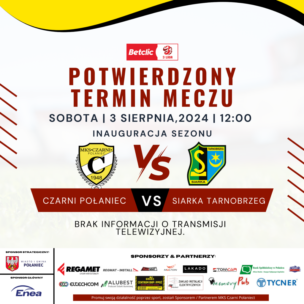 Departament Polskiego Związku Piłki Nożnej wyznaczył termin meczu pierwszej kolejki Betclic trzeciej ligi grupy – IV w, której to MKS Czarni Połaniec w meczu domowym zagrają z Siarką Tarnobrzeg. Spotkanie z w/w drużyną odbędzie się 3 sierpnia br. o godzinie 12:00 – Na stadionie Miejskim w Połańcu przy ul. Sportowej 1.