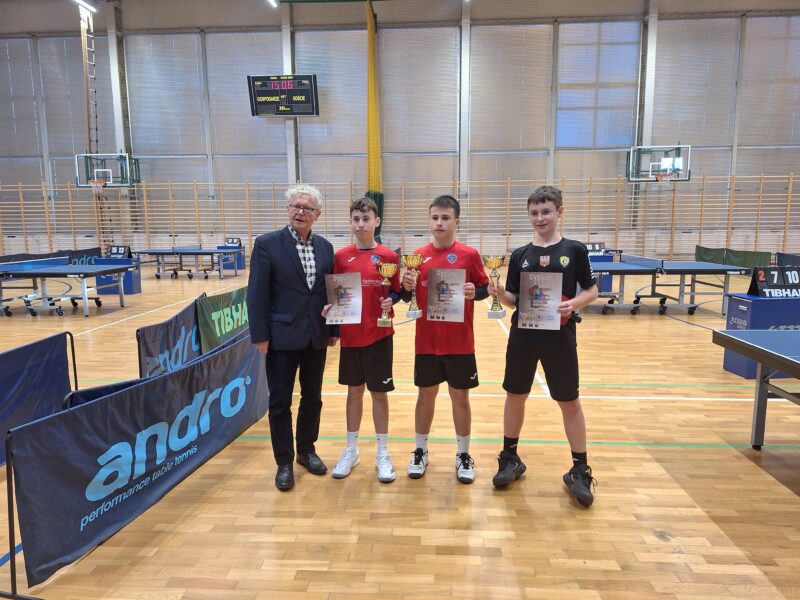 Na załączonym zdjęciu: Zwycięzcy III WTK kadetów wraz z nagrodami wręczonymi przez Prezesa Świętokrzyskiego Okręgowego Związku Tenisa Stołowego dr. Wacława Kruka.