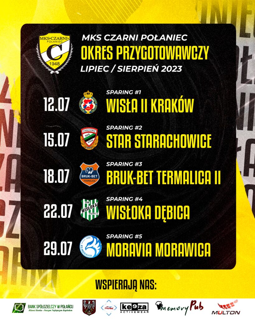 Piłkarze Czarnych Połaniec przygotowania do nowego sezonu rozpoczną w poniedziałek 3 lipca 2023 roku, a pierwszy mecz kontrolny rozegramy 12 lipca w środę z reaktywowaną drużyną rezerw Wisły Kraków.