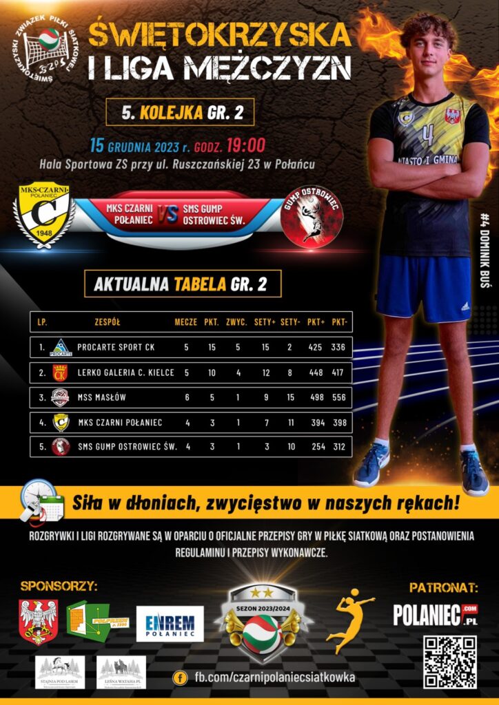W piątek 15 grudnia 2023 roku o godzinie 19:00 – Siatkarska drużyna Czarnych Połaniec zagra w meczu ligowym z Gump Ostrowiec Świętokrzyski. – Mecz zostanie rozegrany w ramach piątej kolejki na szczeblu rozgrywek świętokrzyskiej pierwszej ligi mężczyzn w grupie drugiej. Miejsce rozegrania tego meczu to Hala Sportowa Zespołu Szkół przy ul. Ruszczańskiej 23 w Połańcu.