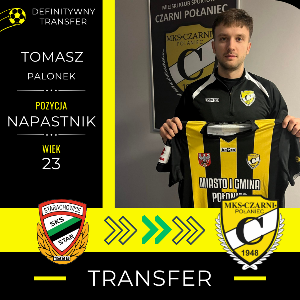 Zespół Czarnych Połaniec zasilił 23-letni napastnik – Tomasz Palonek. Który z Połanieckim Klubem związał się umową do 30 czerwca 2024 roku z opcją przedłużenia o kolejny sezon.