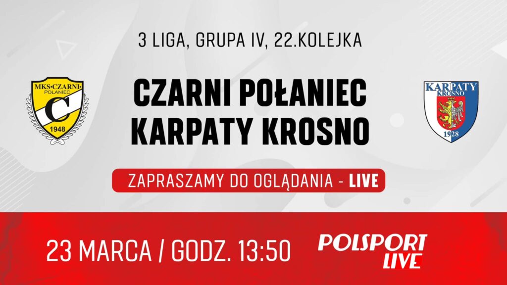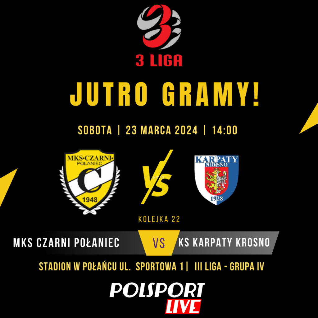 Już jutro, w sobotę 23 marca o godzinie 14:00 – W Połańcu, miejscowy zespół Czarnych zagra z Karpatami Krosno w meczu ligowym w ramach 22 serii gier na poziomie piłkarskiej trzeciej ligi w grupie – IV. Podopieczni Łukasza Cabaja bardzo mocno liczą na przełamanie oraz na wsparcie swoich kibiców, którzy to są 12-zawodnikiem Połanieckiego Klubu.