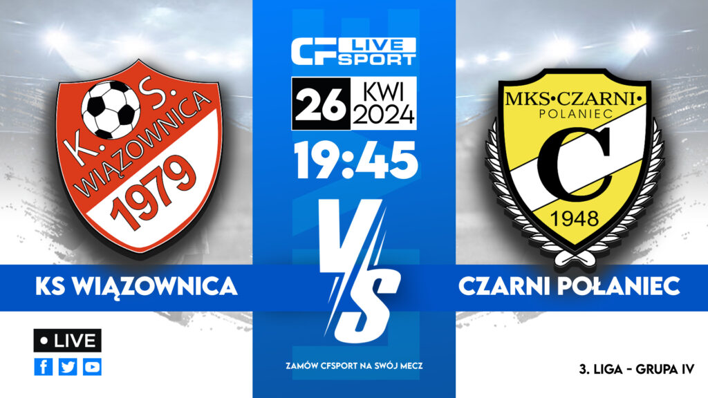 Już w najbliższy piątek zespół MKS Czarni Połaniec zagra na wyjeździe w Wiązownicy z KS Wiązownica. początek spotkania zaplanowano na godzinę 19:45. A będzie to mecz rozgrywany w ramach 27 serii gier na szczeblu piłkarskiej trzeciej ligi w grupie – IV. | Transmisję z tego meczu będzie realizować internetowa telewizja CF Sport.