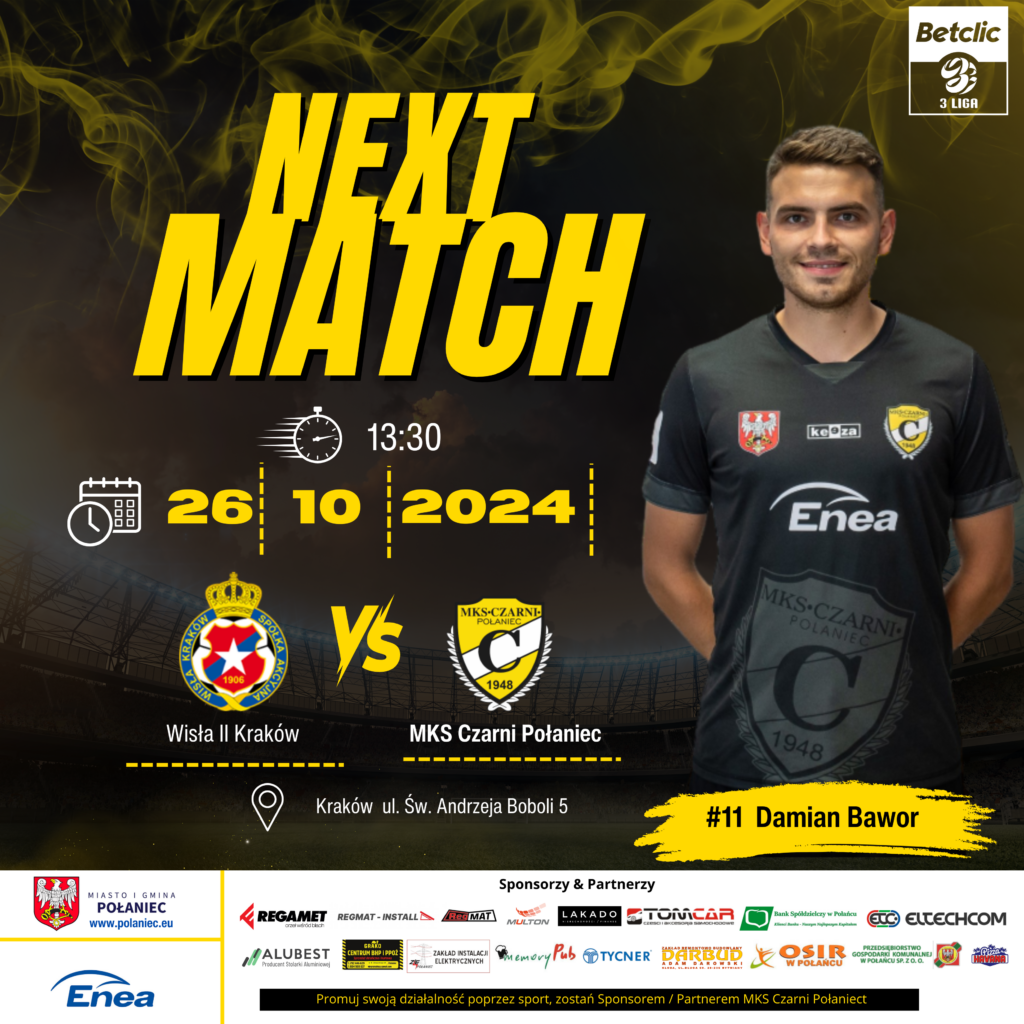 Już jutro w Krakowie, Czarni Połaniec prowadzeni przez Łukasza Cabaja zagrają z rezerwami Krakowskiej Wisły. Spotkanie zostanie rozegrane w ramach 14 serii gier o mistrzostwo – Betclic trzeciej ligi dla grupy – Czwartej. Pierwszy gwizdek sędziego o godzinie 13:30 – Mecz ten zostanie rozegrany na stadionie Prądniczanki Kraków.