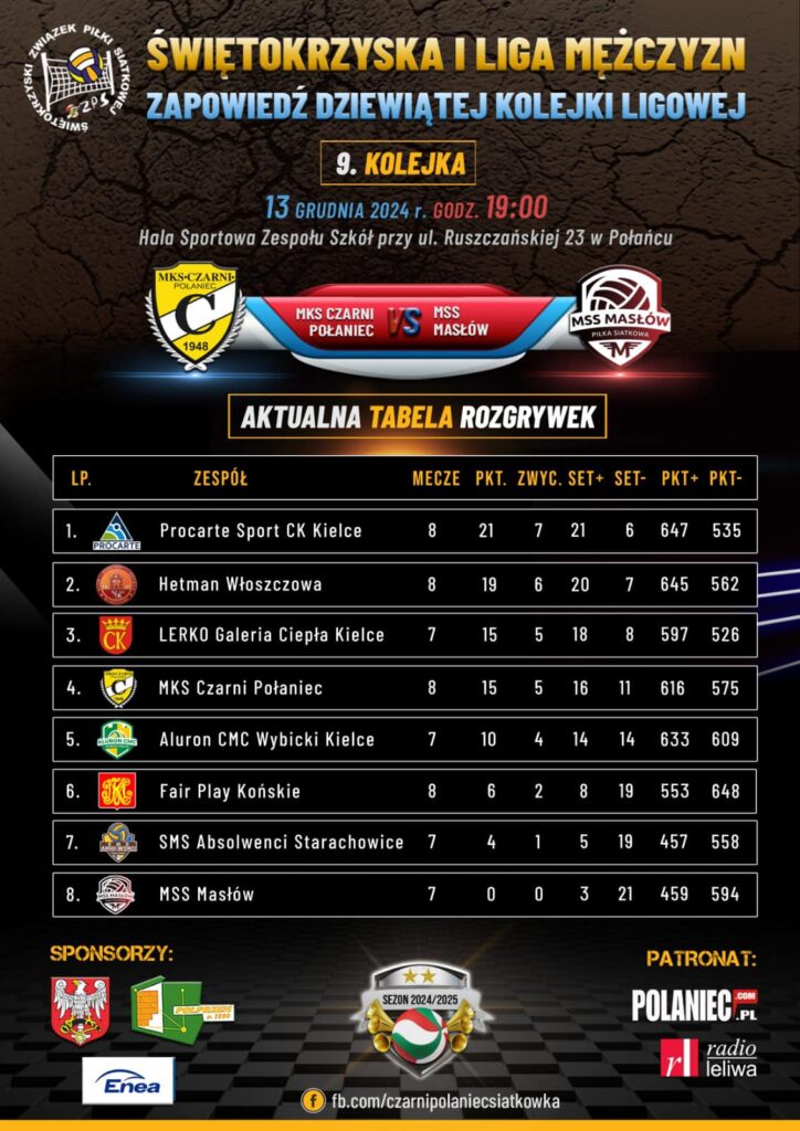 Już dziś o godzinie 19:00 w Połańcu w Hali Sportowej Zespołu Szkół przy ul. Ruszczańskiej 23, zespół siatkarzy MKS Czarni Połaniec zagra z MSS Masłów. Będzie to mecz rozgrywany w ramach 9 kolejki – Świętokrzyskiej pierwszej lidze siatkarzy.