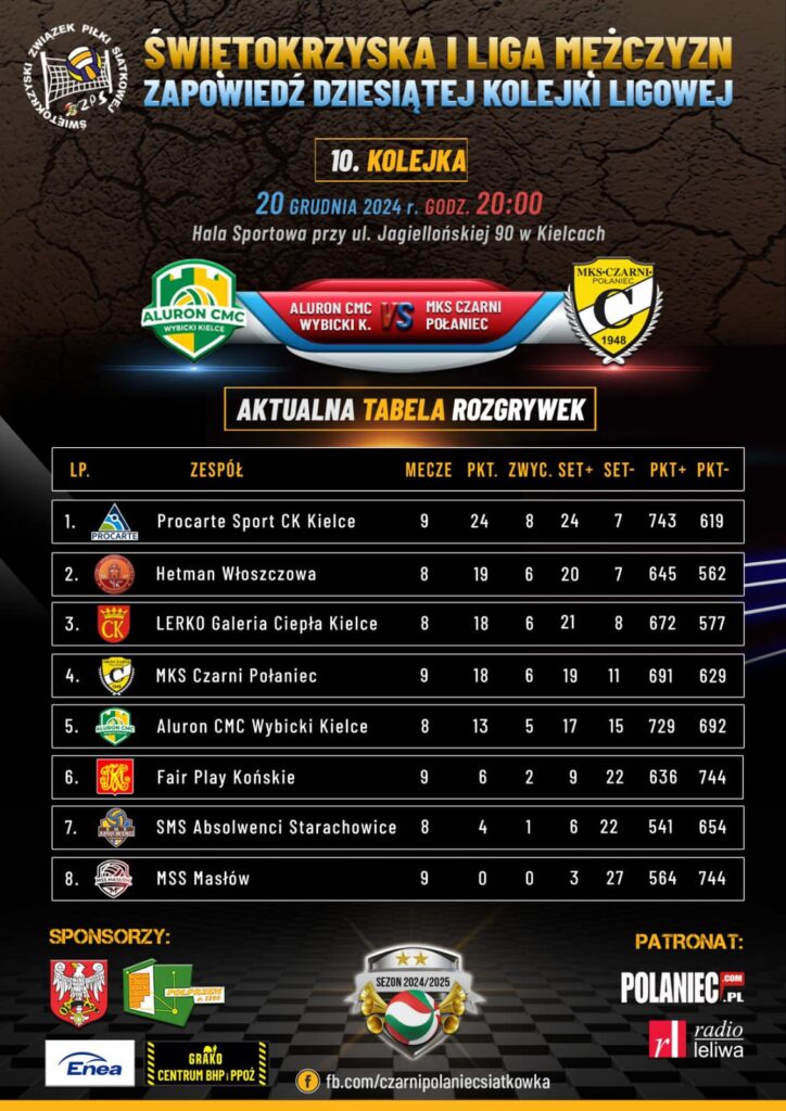 Już dziś o godzinie 20 w Kielcach – Siatkarska drużyna Czarnych Połaniec zagra z Aluron CMC Wybicki Kielce, a ten mecz zostanie rozegrany w ramach 10 kolejki o mistrzostwo Świętokrzyskiej Pierwszej Ligi – Męzczyzn.