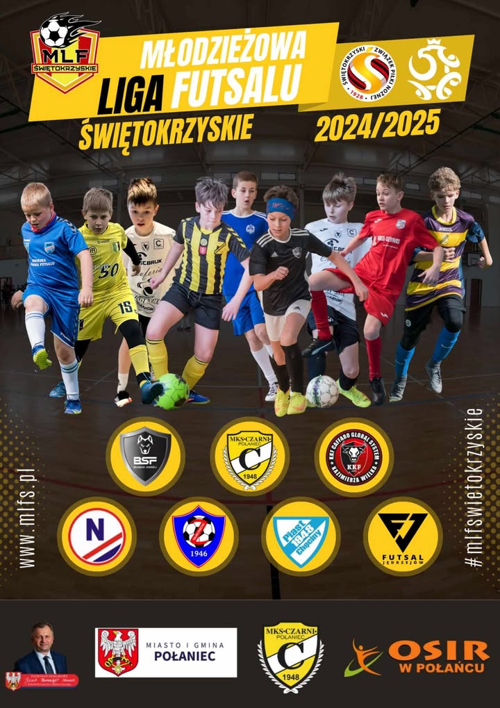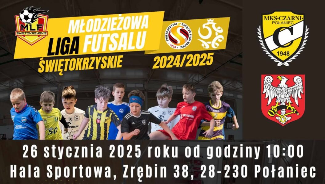 Miasto i Gmina Połaniec – Zaprasza na Start Świętokrzyskiej Młodzieżowej Ligi Futsalu w kategorii U15. Niedziela 26 stycznia 2025 godzina 10.00 w Nowej Hali Sportowej przy Szkole Podstawowej w Zrębinie! Zrębin 38, 28-230 Połaniec.