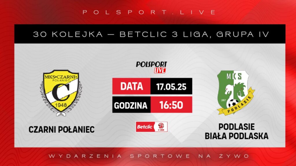 Rozgrywki ligowe wchodzą już na ostatnią prostą, Czarni Połaniec zagrają jutro przed własną publicznością z MKS Podlasie Biała Podlaska. Spotkanie odbędzie się w ramach 30 serii gier na szczeblu Betclic 3 ligi dla grupy – IV. Pierwszy gwizdek jutrzejszych zawodów o godzinie 17:00 – Wyznaczonym sędzią jutrzejszego meczu będzie Michał Grabowski z Przemyśla.