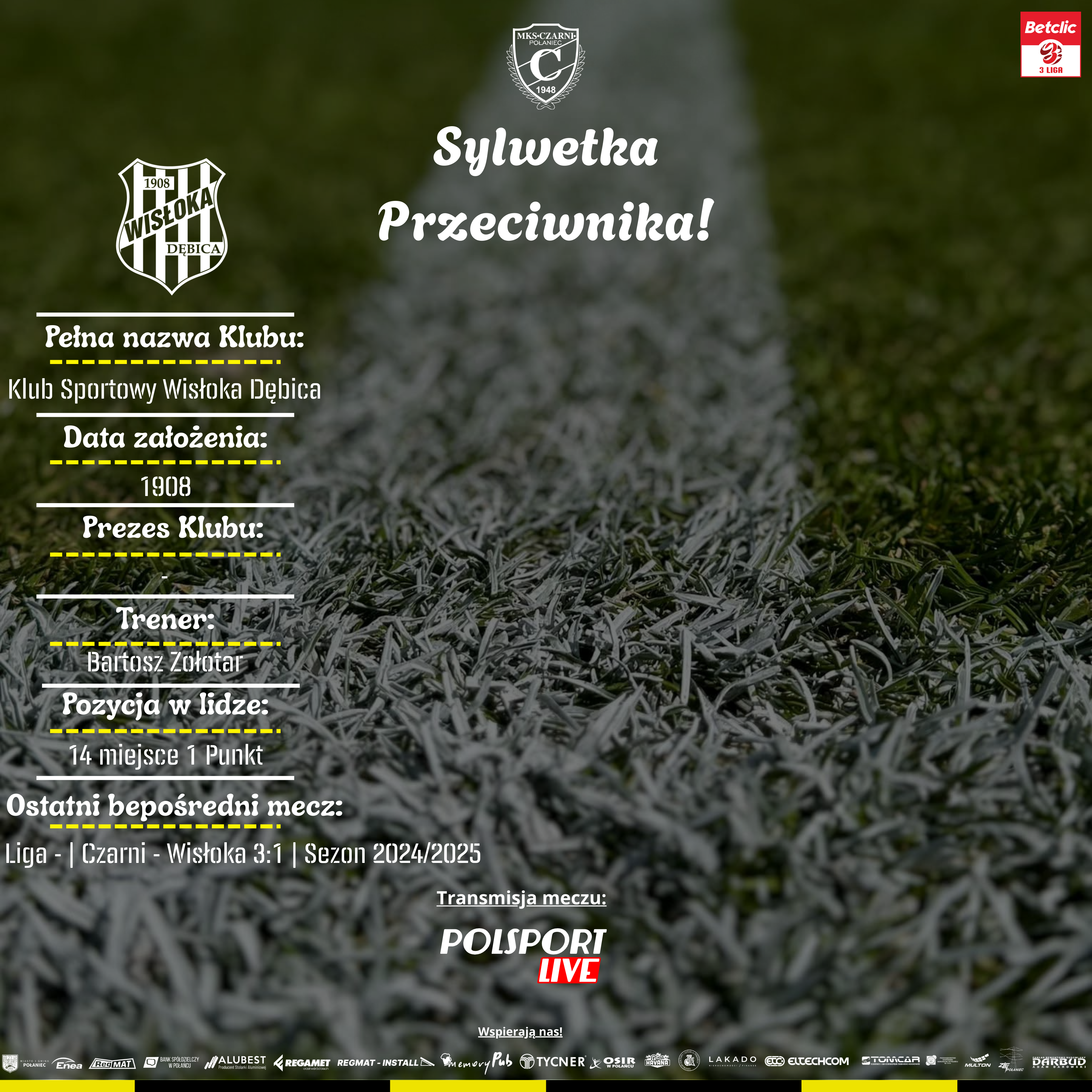 – Naszym jutrzejszym rywalem będzie „Klub Sportowy Wisłoka Dębica” – Klub ten został założony w 1908 roku. Klub ten przywdziewa barwy „biało-zielone”. Klub Wisłoka Dębica po rozegraniu dwóch meczów zgromadził 1 punkt, co przekłada się na 14 miejsce w ligowej tabeli. W miniony weekend zespół z Dębicy przegrał w meczu domowym z – KSZO 1929 Ostrowiec Świętokrzyski 0:1.