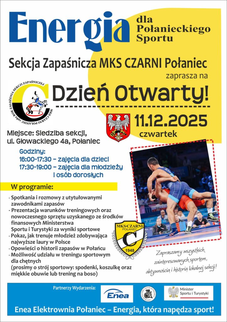 🤼♀️Sekcja Zapaśnicza MKS Czarni Połaniec serdecznie zaprasza na Dzień Otwarty, który odbędzie się 🗓️11 grudnia 2025 roku w siedzibie klubu 📍w Połańcu przy ul. Głowackiego 4a. Wydarzenie będzie doskonałą okazją, by poznać działalność sekcji „od kuchni”, zobaczyć profesjonalne warunki treningowe oraz spotkać utytułowanych zawodników odnoszących sukcesy na arenie krajowej i międzynarodowej.