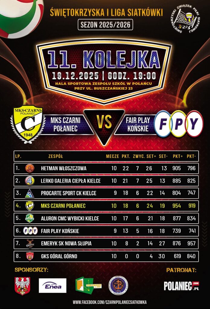 Dzisiaj o godzinie 19:00 w Hali Sportowej Zespołu Szkół w Połańcu, Siatkarska drużyna mężczyzn MKS Czarni Połaniec zagra z Fair Play Końskie. Spotkanie to zostanie rozegrane w ramach 11 kolejki na poziomie Świętokrzyskiej 1 ligi piłki siatkowej.