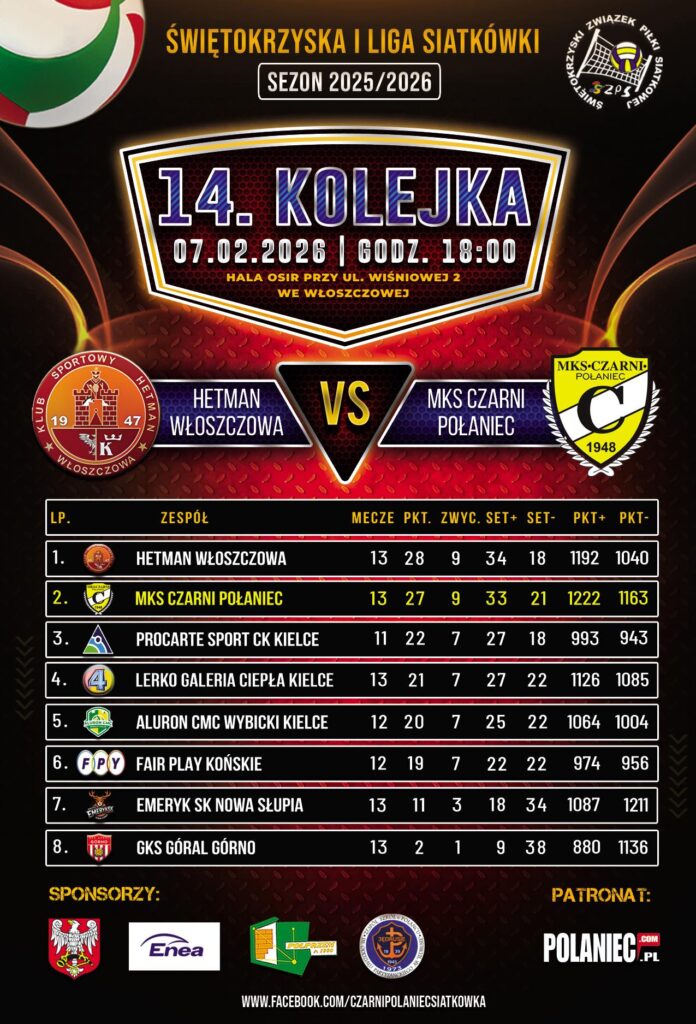 Przed nami najważniejszy wieczór sezonu zasadniczego 2025/2026 w Świętokrzyskiej I Lidze Siatkówki. Już dziś o godzinie 18:00, w bezpośrednim starciu o pierwsze miejsce w tabeli, zmierzą się dwie czołowe ekipy regionu: Hetman Włoszczowa oraz nasi Żółto-Czarni – MKS Czarni Połaniec.