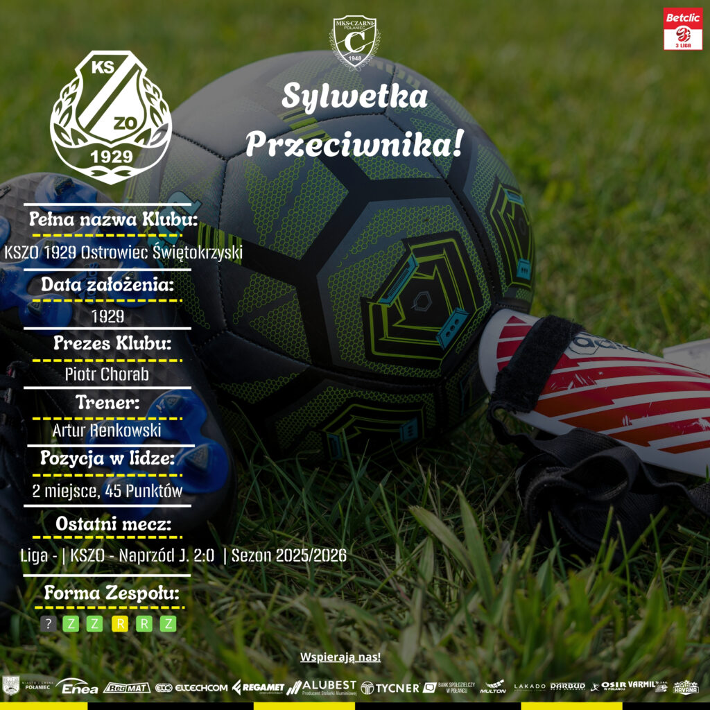 KSZO 1929 Ostrowiec Świętokrzyski – Przyjeżdża do Połańca w roli faworyta. Zespół z Ostrowca Świętokrzyskiego zajmuje obecnie 2. miejsce w tabeli z dorobkiem 45 punktów. Ich bilans w tym sezonie budzi respekt: