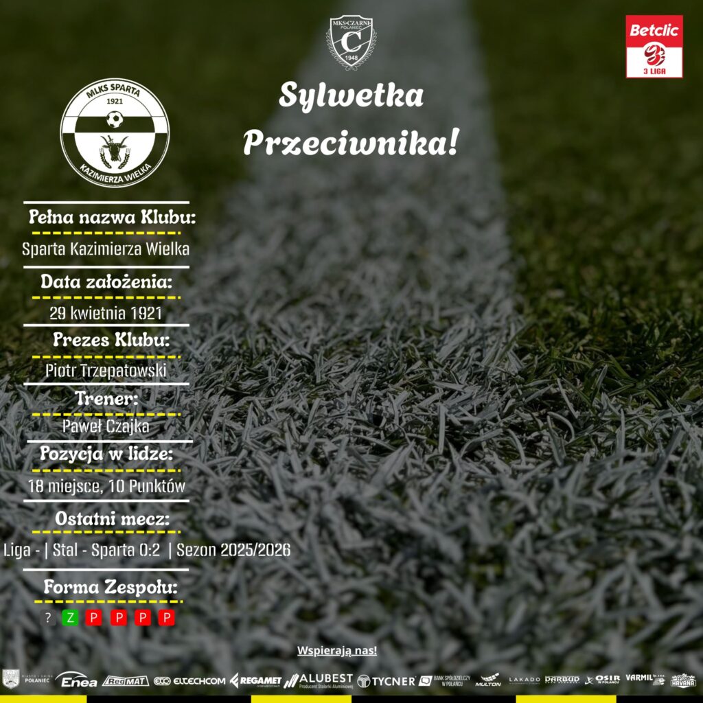 MLKS Sparta Kazimierza Wielka to klub o bogatej, ponad stuletniej historii. Założona 29 kwietnia 1921 roku, Klub przygotowuje się obecnie do obchodów swojego 105-lecia, co nadaje nadchodzącym spotkaniom dodatkowego wymiaru prestiżowego. Choć w bieżącej kampanii zespół prowadzony przez trenera Pawła Czajkę mierzy się z trudną misją utrzymania w Betclic 3. Lidze, ostatnie wydarzenia pokazują, że skreślanie ekipy z Kazimierzy Wielkiej jest przedwczesne.